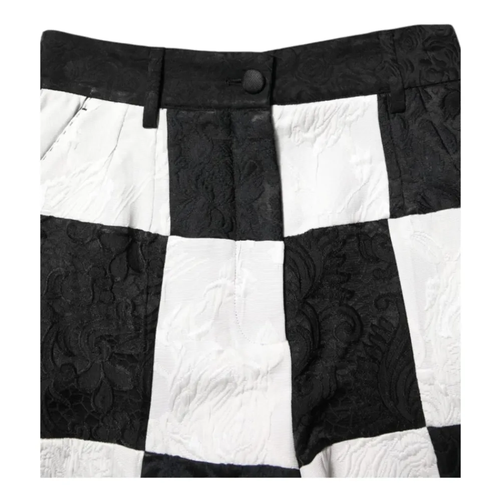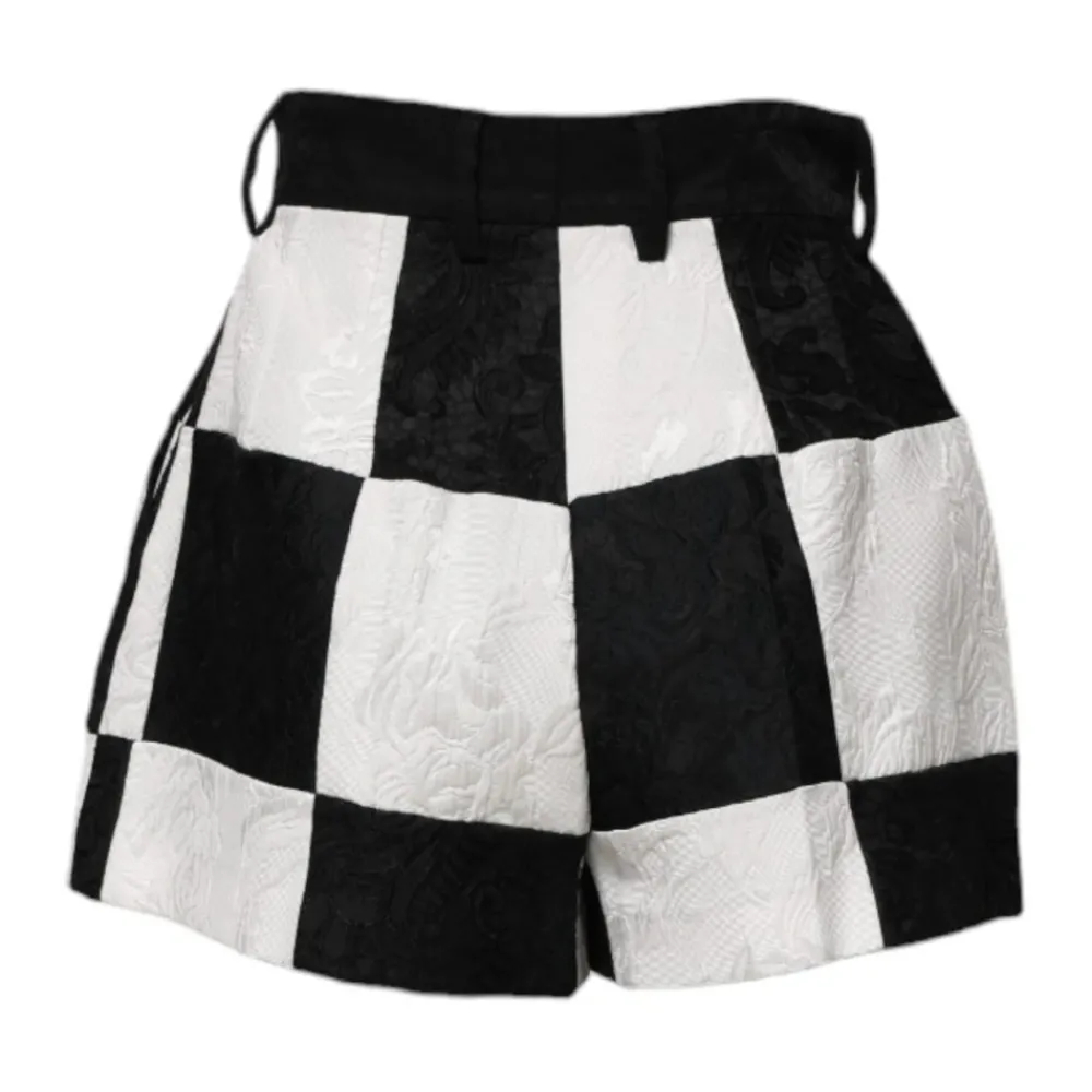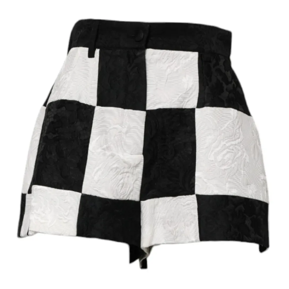 Upgrade je sportkleding met deze prachtige Dolce & Gabbana hoge taille trainingsshorts. Gemaakt in Italië met een bloemig brokaatontwerp, deze authentieke shorts zijn gemaakt van een mix van polyester, katoen, acetaat, zijde, acryl, wol en viscose. De opvallende zwart-witte kleurencombinatie en ritssluiting voegen een vleugje luxe toe aan je fitnessroutine.