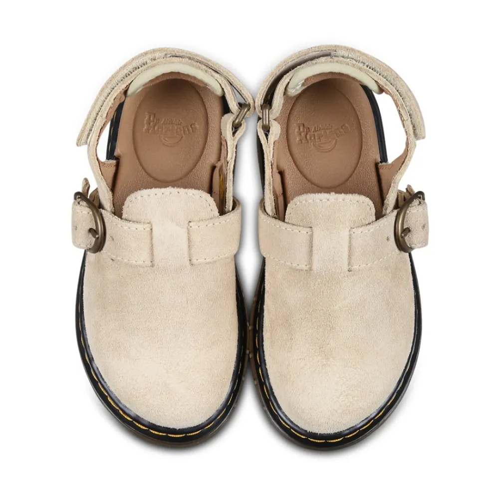Verrijk je zomerse stijl met deze beige suède muiltjes van Dr. Martens, voorzien van een rubberen zool en iconische gele stiksels. Belangrijkste kenmerken: Beige | 100% Leer | Hielband met klittenbandsluiting | Zijgesp versierd met iconische gele stiksels | Samenstelling en onderhoud: 100% Leer