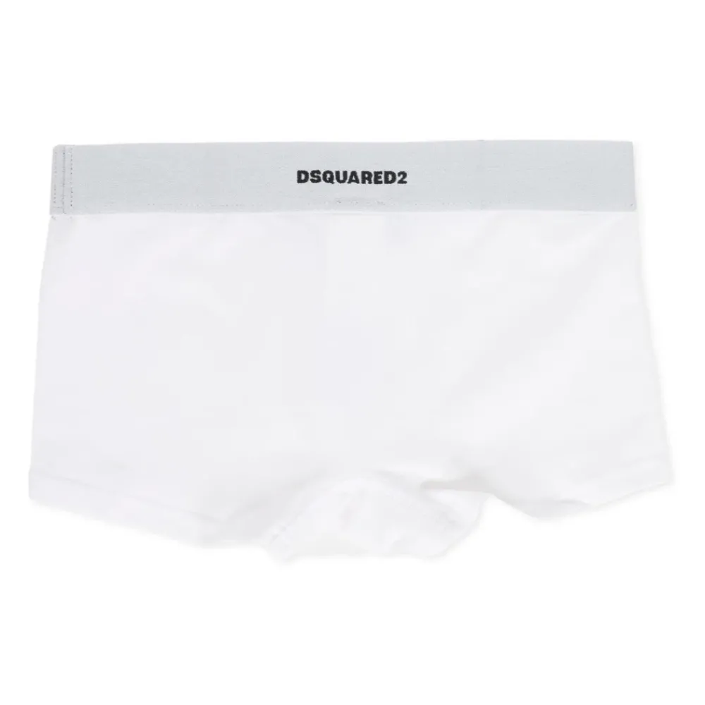Upgrade de essentiële items van je kleintje met deze witte Dsquared2 boxershorts. Gemaakt van een comfortabele mix van 95% katoen en 5% elastaan, met een elastische tailleband en het iconische logo op de voorkant. Machinewasbaar op 30°C.