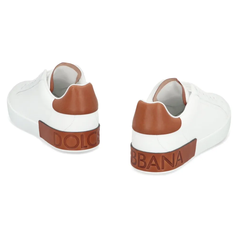 De Dolce & Gabbana Portofino Leather Sneakers combineren een strak, klassiek profiel met een contrasterend detail op de hiel voor een casual-chique uitstraling. Ontworpen voor dagelijks comfort, ze combineren lederen constructie met een rubberen zool met logo. Belangrijkste kenmerken: Wit | Kalfsleer | Platte veters | Kalfslederen voetbed | Rubberen zool | Contrasterende hielkap van kalfsleer met logo | Ronde neus | Logo in reliëf op de tong | Rubberen spoiler met logo | Afmetingen & pasvorm: Zoolhoogte: 15 mm | Samenstelling & onderhoud: 100% kalfsleer | 100% rubber