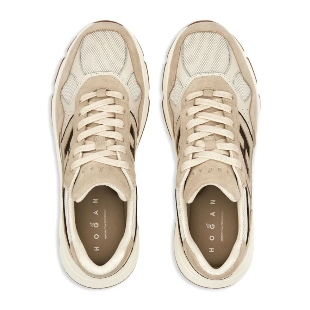 Hogan sneakers voor heren in licht beige met vetersluiting aan de voorkant, memory foam binnenzool, appliqué logo en geperforeerde details. Hogan valt over het algemeen groot uit. Overweeg een maat kleiner te nemen.
