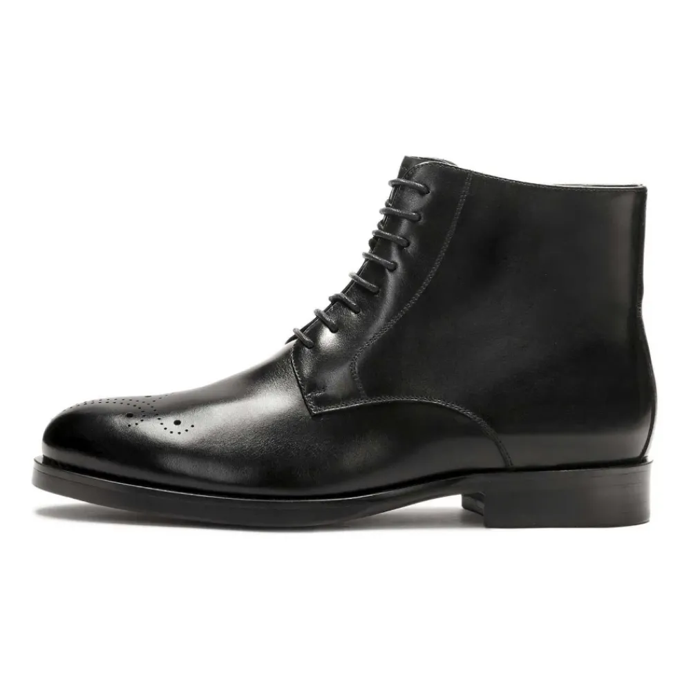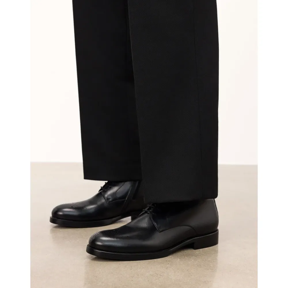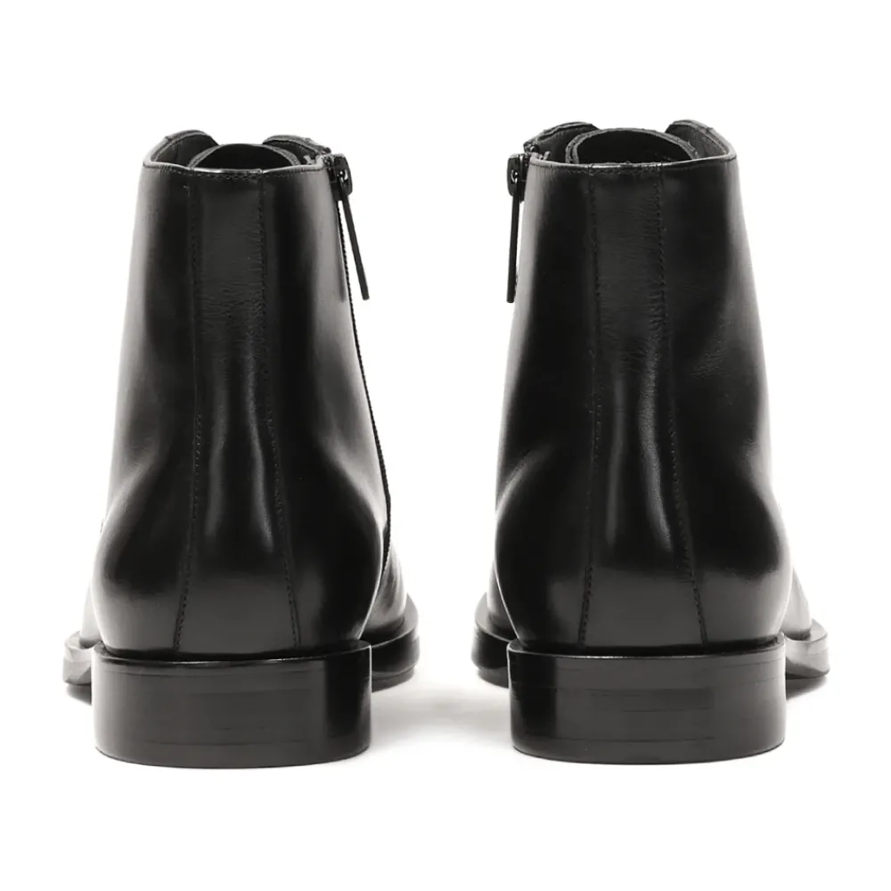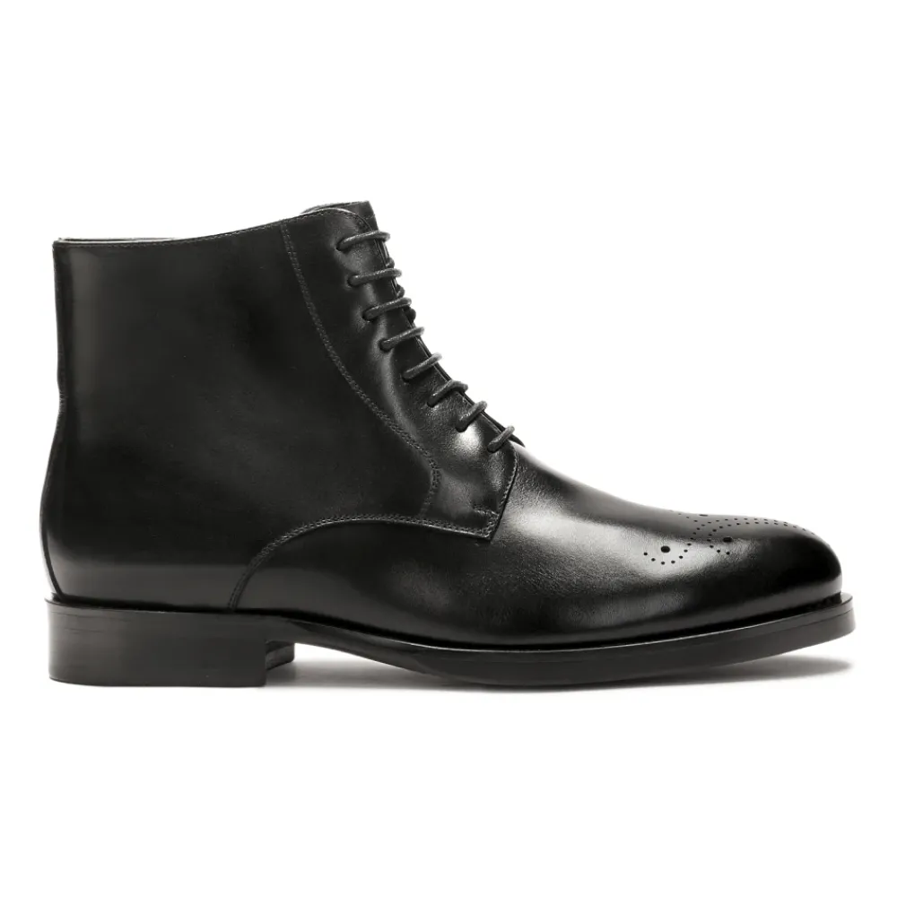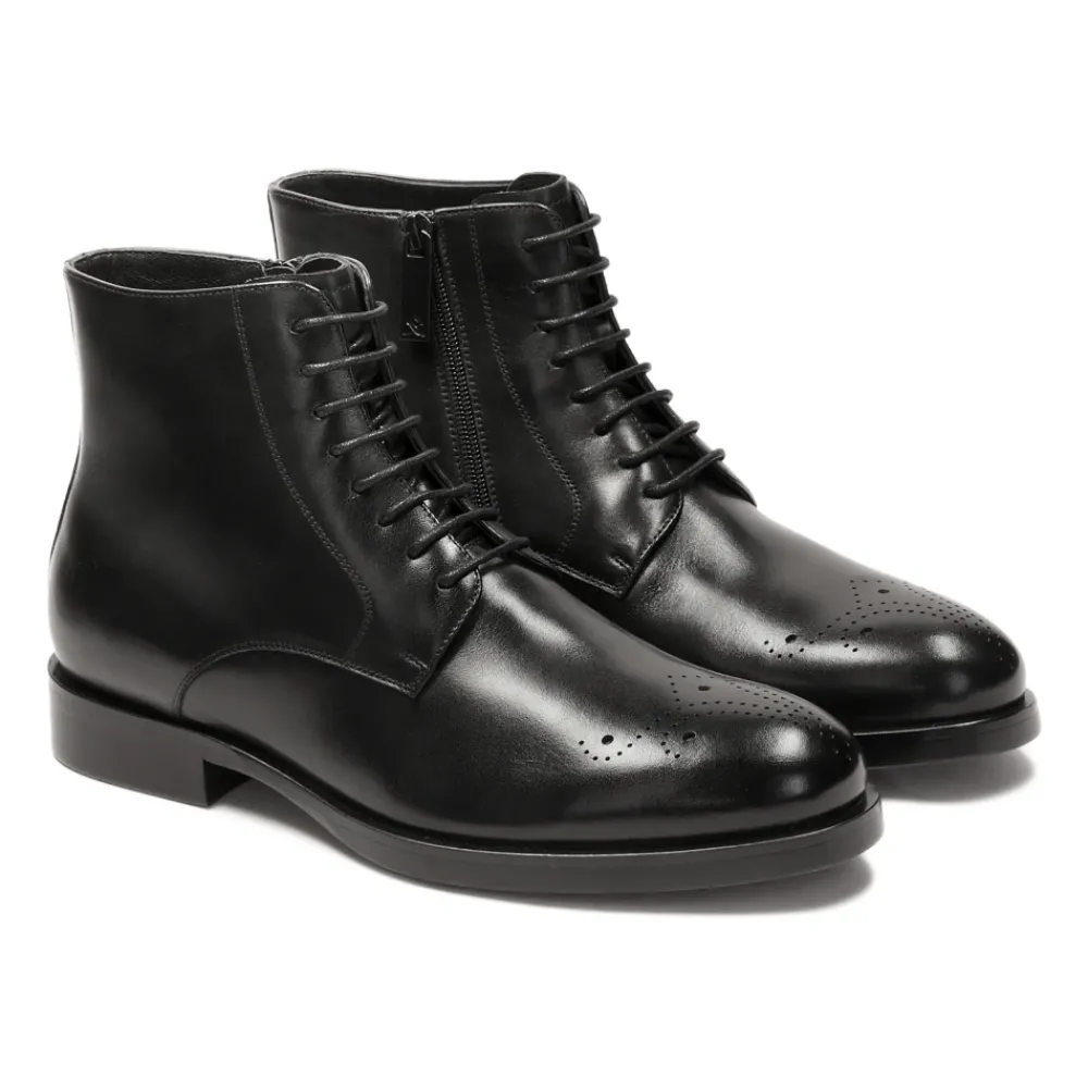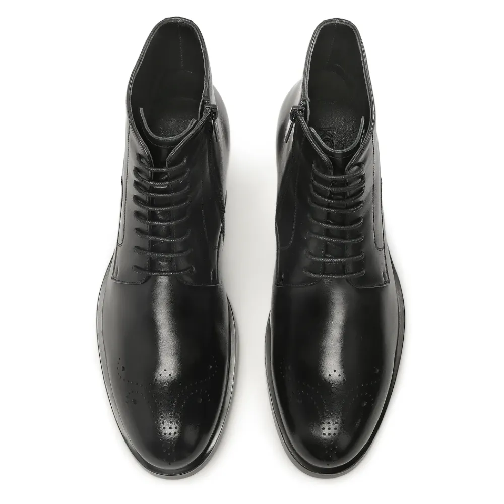 Klassieke laarzen gemaakt van hoogwaardig, glad nerfleer in een diepe zwarte tint. Het model combineert elegantie met praktisch, dus het is perfect voor zowel formele als semi-formele styling. De hoge, met veters omwikkelde bovenkant zorgt voor een perfecte pasvorm aan de voet, en de verborgen rits aan de binnenkant maakt het mogelijk om de schoen snel aan en uit te trekken zonder telkens te hoeven strikken. Subtiele open decoratie op de neus – geïnspireerd op het klassieke brogue patroon – voegt een nobel karakter en tijdloze stijl toe aan de schoenen. De gebalanceerde silhouet, stevige zool en oog voor detail maken dit model ideaal voor een man die elegantie en comfort waardeert. Uitzonderlijk comfort en gebruiksgemak wordt geboden door een zachte schapenvachtvoering.