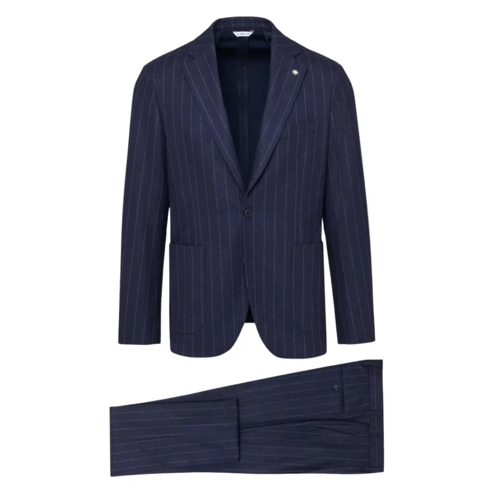 Manuel Ritz Abito Gessato is een single-breasted pak in blauw met een krijtstreepmotief, ontworpen voor nette en formele gelegenheden. Belangrijkste kenmerken: Blue | Blu | Polyester | Single-breasted | Krijtstreep | Pak | Afmetingen & pasvorm: Regular fit | Samenstelling & onderhoud: 57% Polyester, 39% Viscose, 4% Elastane