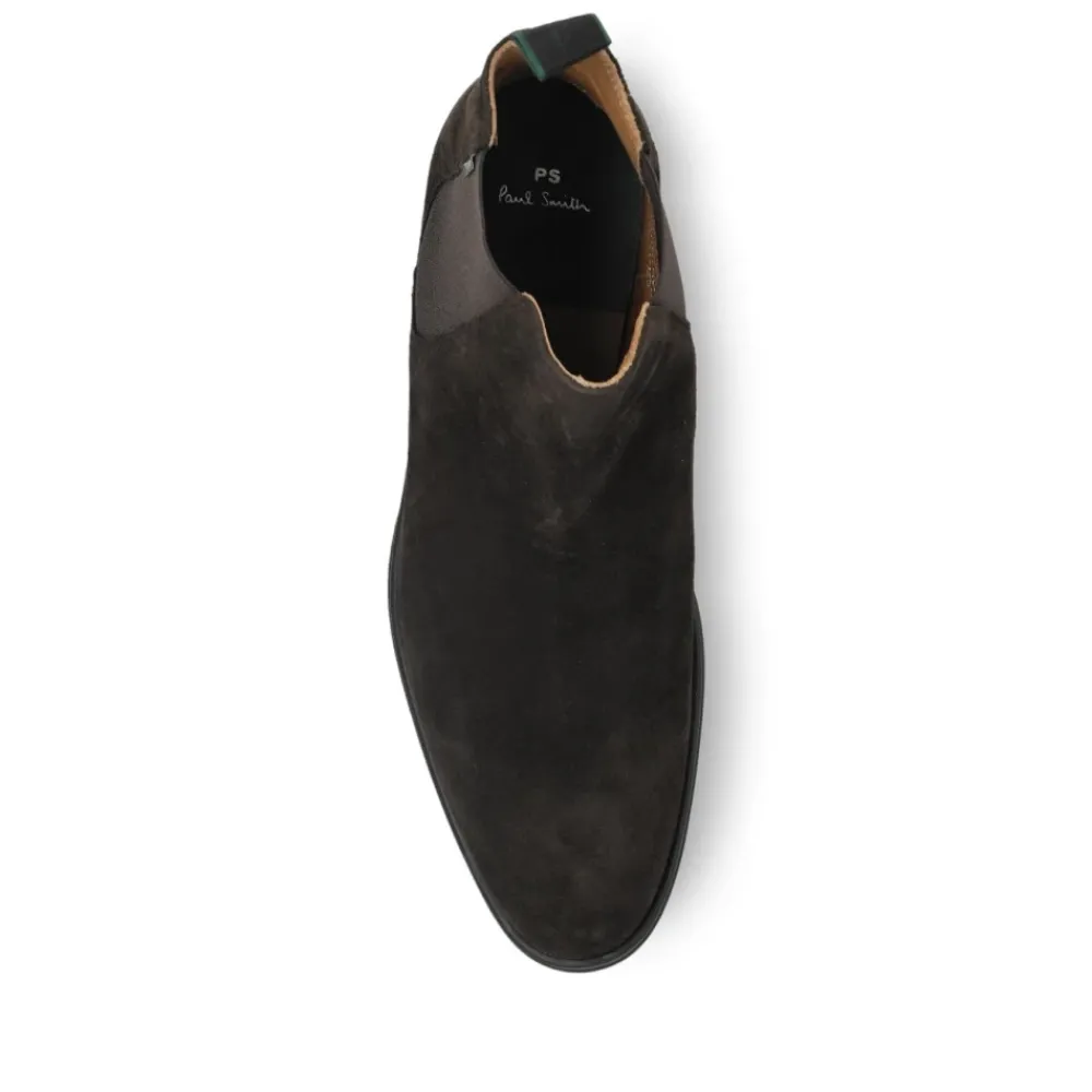 Paul Smith Augustus Chelsea Boot in suède combineert een getailleerd, slank Chelsea silhouet met gemakkelijk aan- en uitcomfort. Ideaal voor smart-casual looks waar een verfijnde maar veelzijdige laars vereist is. Belangrijkste kenmerken: Bruin | Suède | rubberen zool | Elastische zijpanelen | Trekker aan de hiel | Slip-on model | Chelsea boot silhouet | Ronde neus | Minimalistisch bovenwerk | Subtiele PS Paul Smith branding | Afmetingen & pasvorm: Slank silhouet