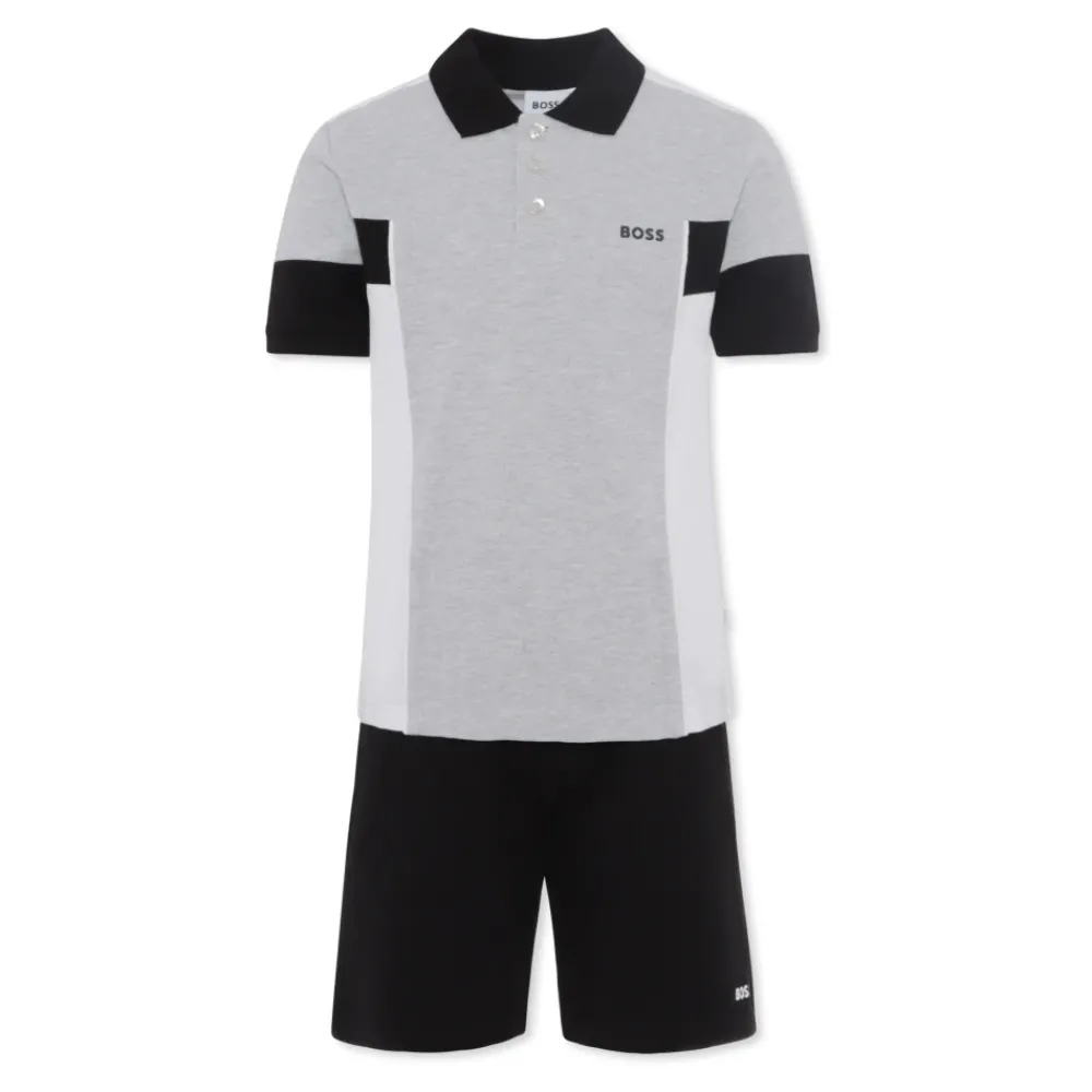 Kleed je kleintje in stijl met deze Hugo kinder jumpsuit in grijs. De set bevat een katoenen piqué polo met korte mouwen, kraag en knoopsluiting aan de voorkant, versierd met een bedrukt logo op de borst. De zwarte shorts hebben een elastische taille, trekkoord, zijzakken en een logodetail onderaan. Gemaakt van 100% katoen, is deze outfit zowel comfortabel als stijlvol. Machinewasbaar op 30°C voor eenvoudig onderhoud.