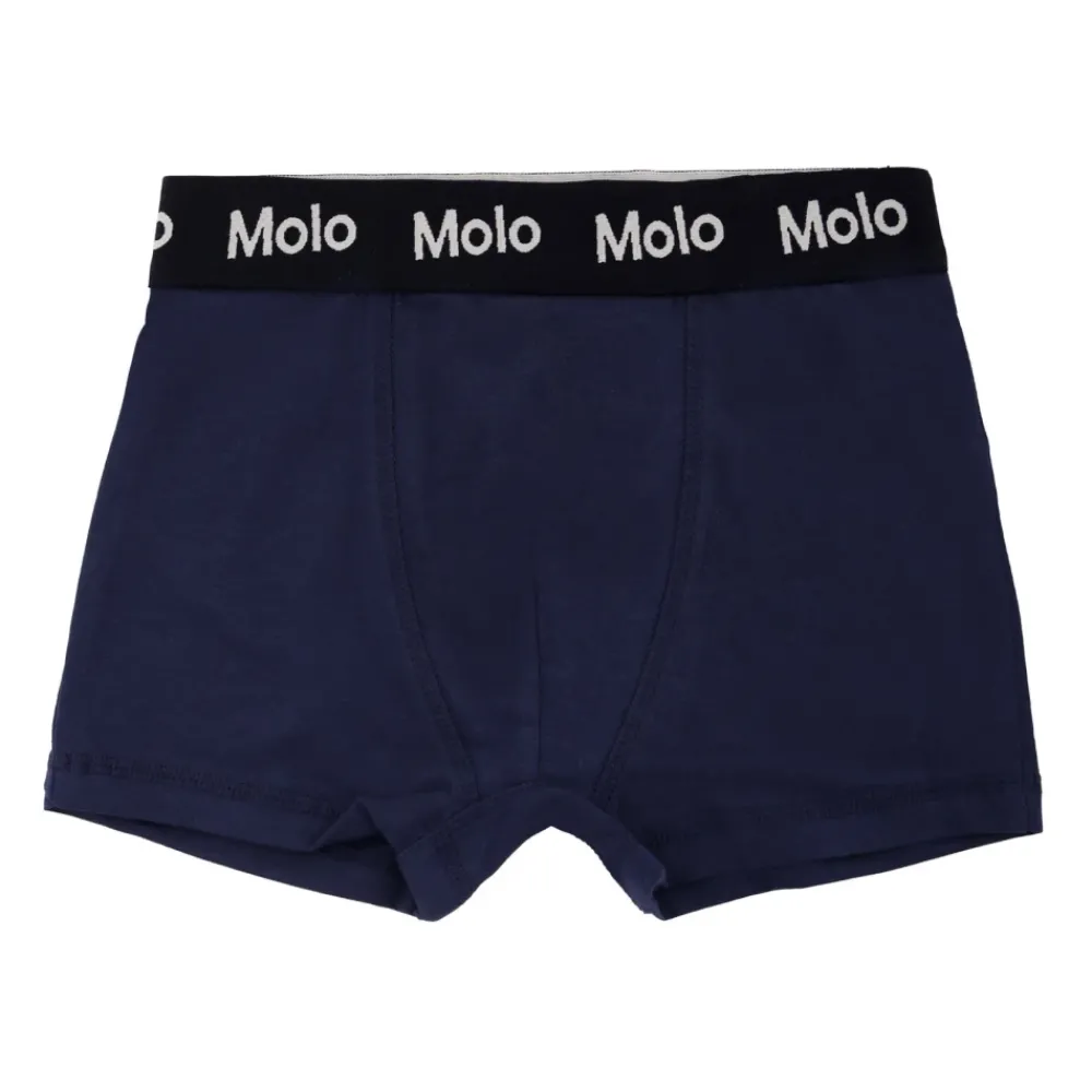 Kleed je kleintje in stijl met deze blauwe boxersuit van Molo. Gemaakt van GOTS-gecertificeerde katoenmix, bestaande uit twee boxershorts met een elastische tailleband met logo. Een boxer is versierd met een allover dinosaurusprint. Gemaakt van 95% katoen en 5% elastaan. Machinewas op 30°C.