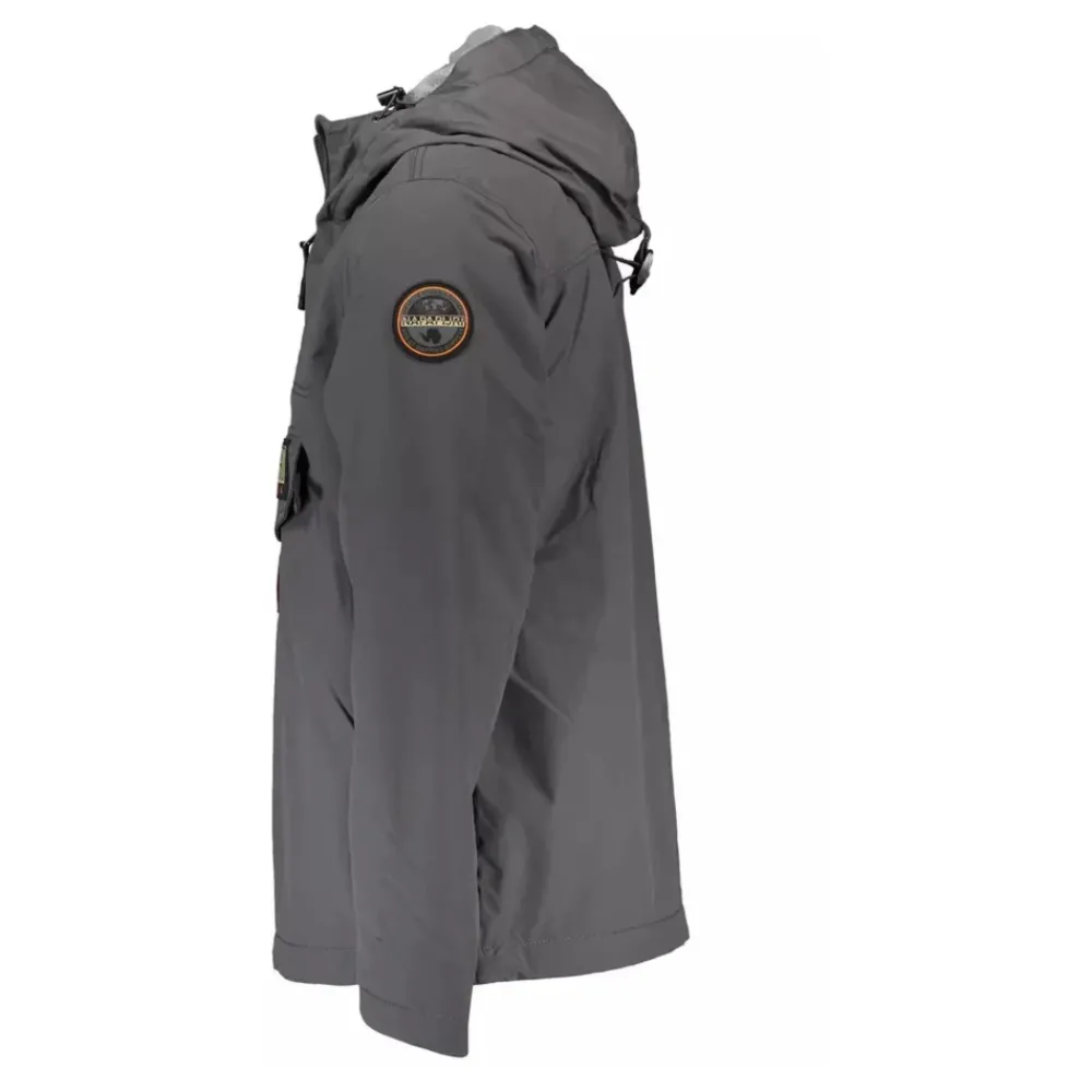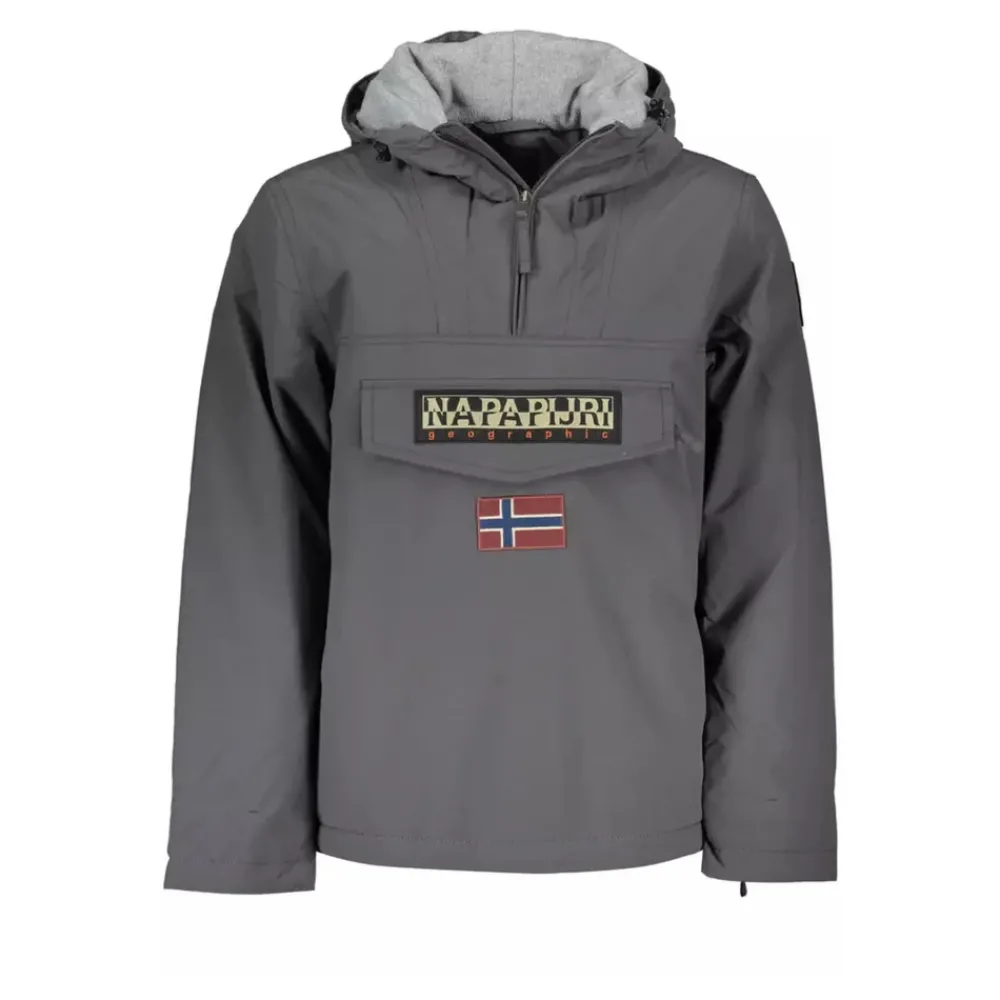 Blijf beschermd tegen de elementen met deze grijze polyamide jas van Napapijri. Ontworpen voor mannen, heeft deze langemouwen regenwoudstijl jas een capuchon voor extra dekking. Het heeft ook een centrale zak met ritssluiting en viltsluiting, evenals een zijrits voor extra gemak. De jas is gemaakt van 30% gerecyclede materialen en toont het logo van het merk. Perfect voor outdoor avonturen.