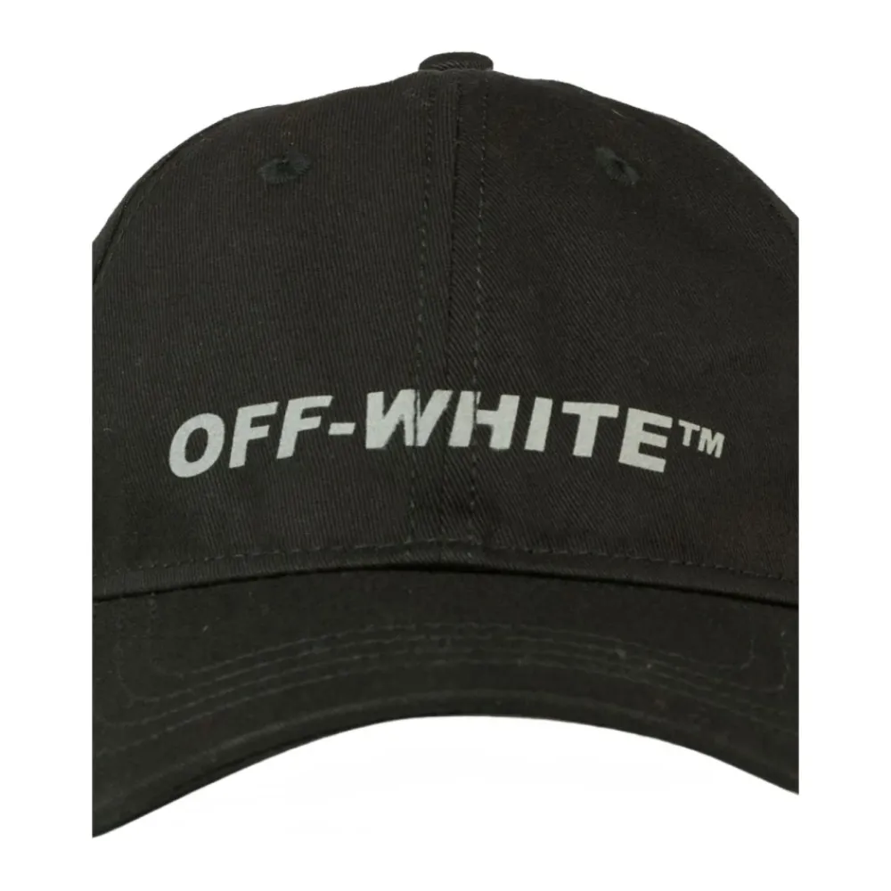 Off White zwarte katoenen platte rand hoed voor jongens met verstelbare achterband, zes panelen en logo borduursel.