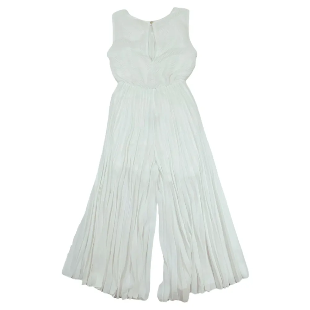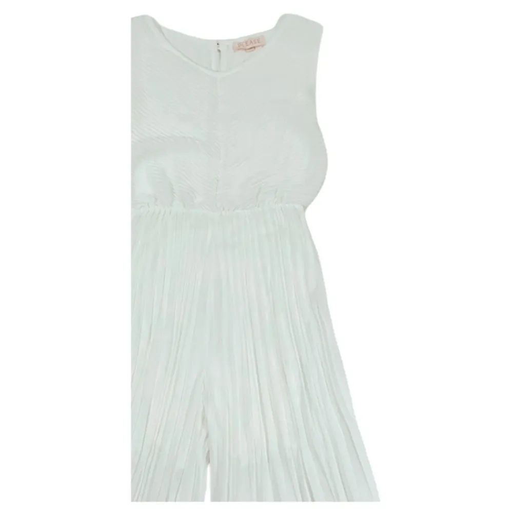 Deze Fully Pleated Jumpsuit Dress combineert de look van een geplooide jurk met het silhouet van een jumpsuit, met een mouwloze ronde hals en een uitlopende pijp voor formele gelegenheden. Belangrijkste kenmerken: Wit | Polyester | Knoopsluiting aan de achterkant | Gevoerd | Volledig geplooid | Jumpsuit ontwerp | Mouwloos | Ronde hals | Uitlopende pijp | Samenstelling & verzorging: 100% polyester | Voering: 95% viscose, 5% elastaan
