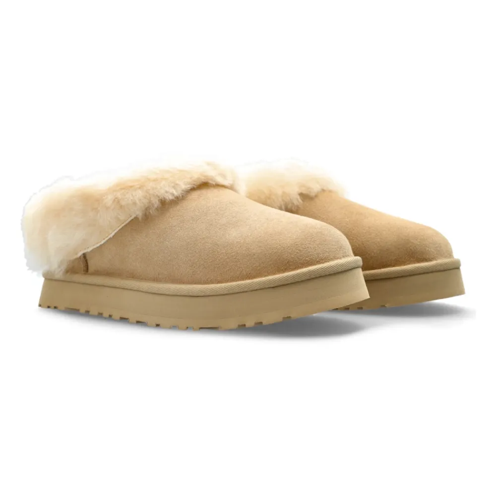UGG K Tazzelle Shoes combineren de zachte warmte van schapenvacht met een lichtgewicht platform voor eenvoudig instapcomfort en veelzijdige binnen- en buitenshuis gebruik. Belangrijkste kenmerken: Beige | Suède | Warme schapenvachtvoering | Lichtgewicht zool van suikerriet-EVA | Gedempt platform | Brede instapopening | Treklus aan de achterkant | Vaste manchet | Fluffy manchet | Laag silhouet | Minimalistische details | Afmetingen en pasvorm: Zoolhoogte: 2,5 cm | Samenstelling en verzorging: Bovenwerk van suède | Voering en binnenzool van schapenvacht | Tussenzool/buitenzool van suikerriet-EVA | Textielbinding